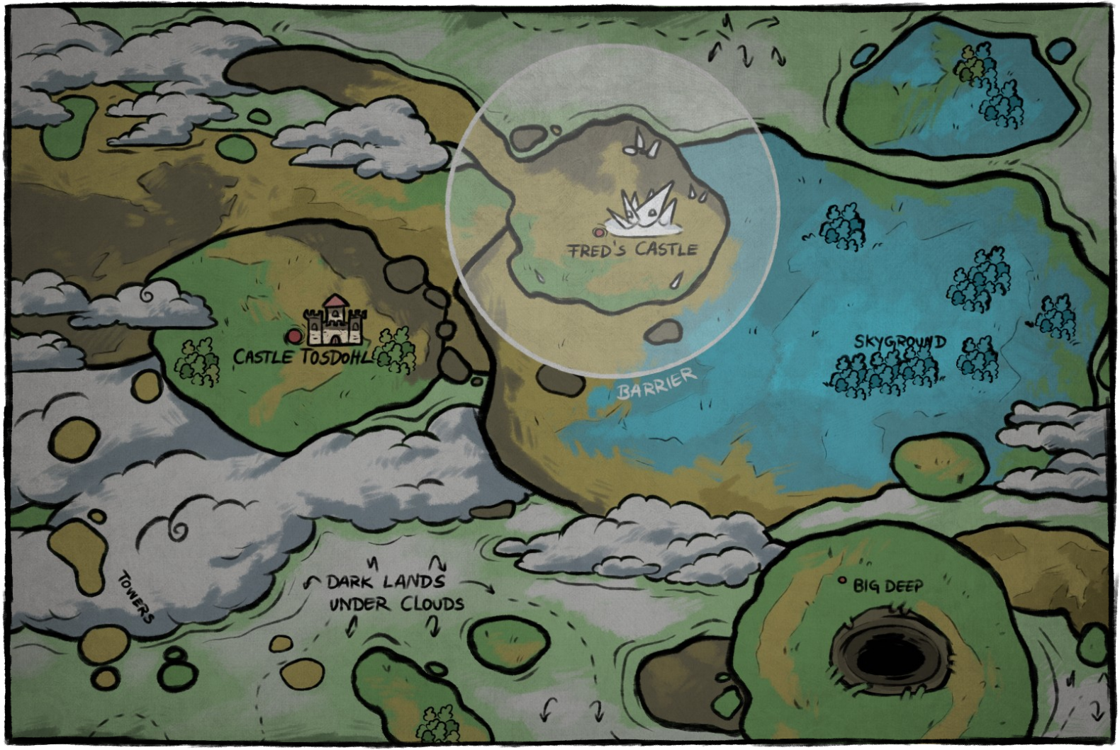 Right above the village, covered by clouds is a magical world, full of supernatural beings & related who are doing things secretly and hidden from the rest of the world... And of course, castle Tosdohl, which is the most populated and famous area up there.